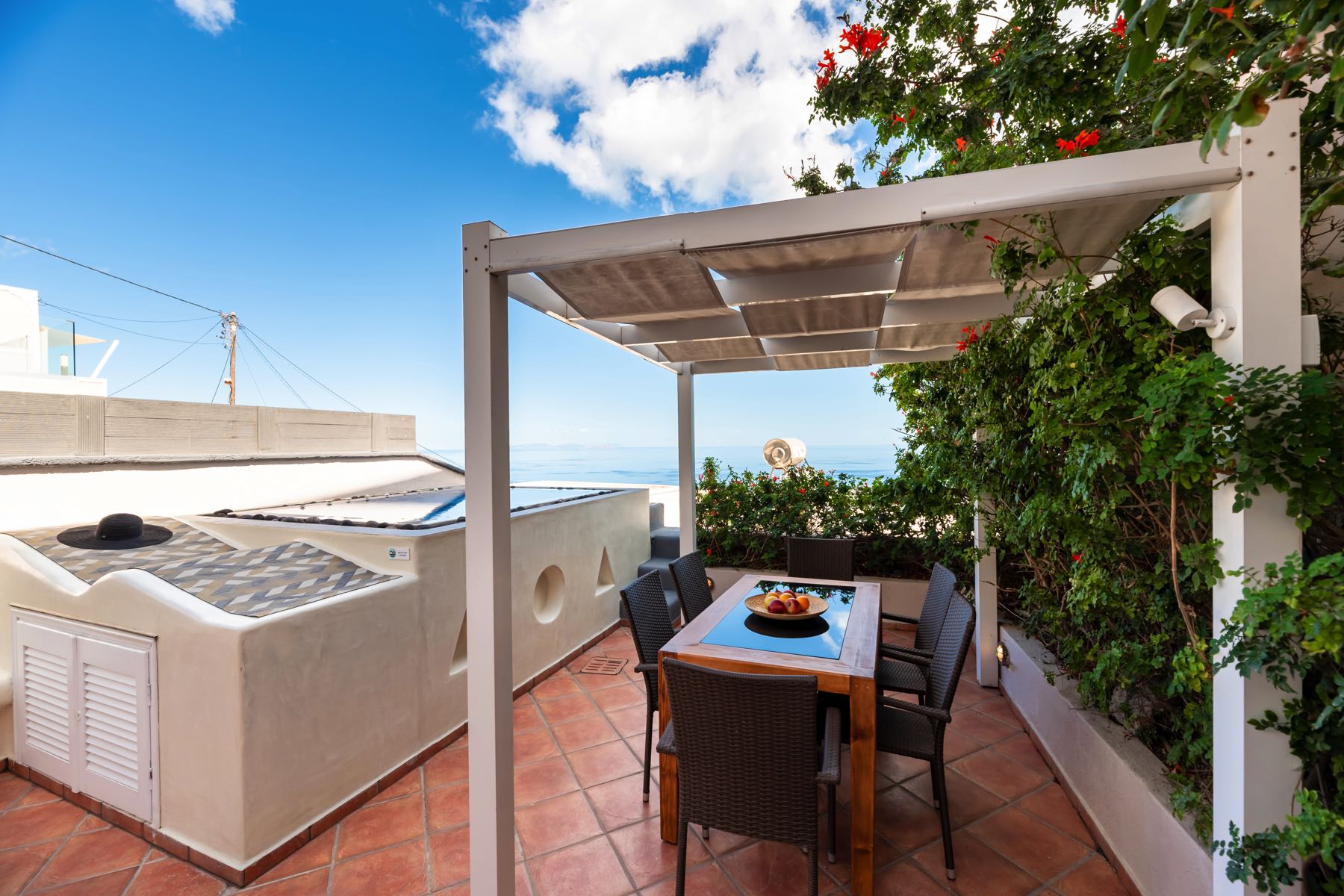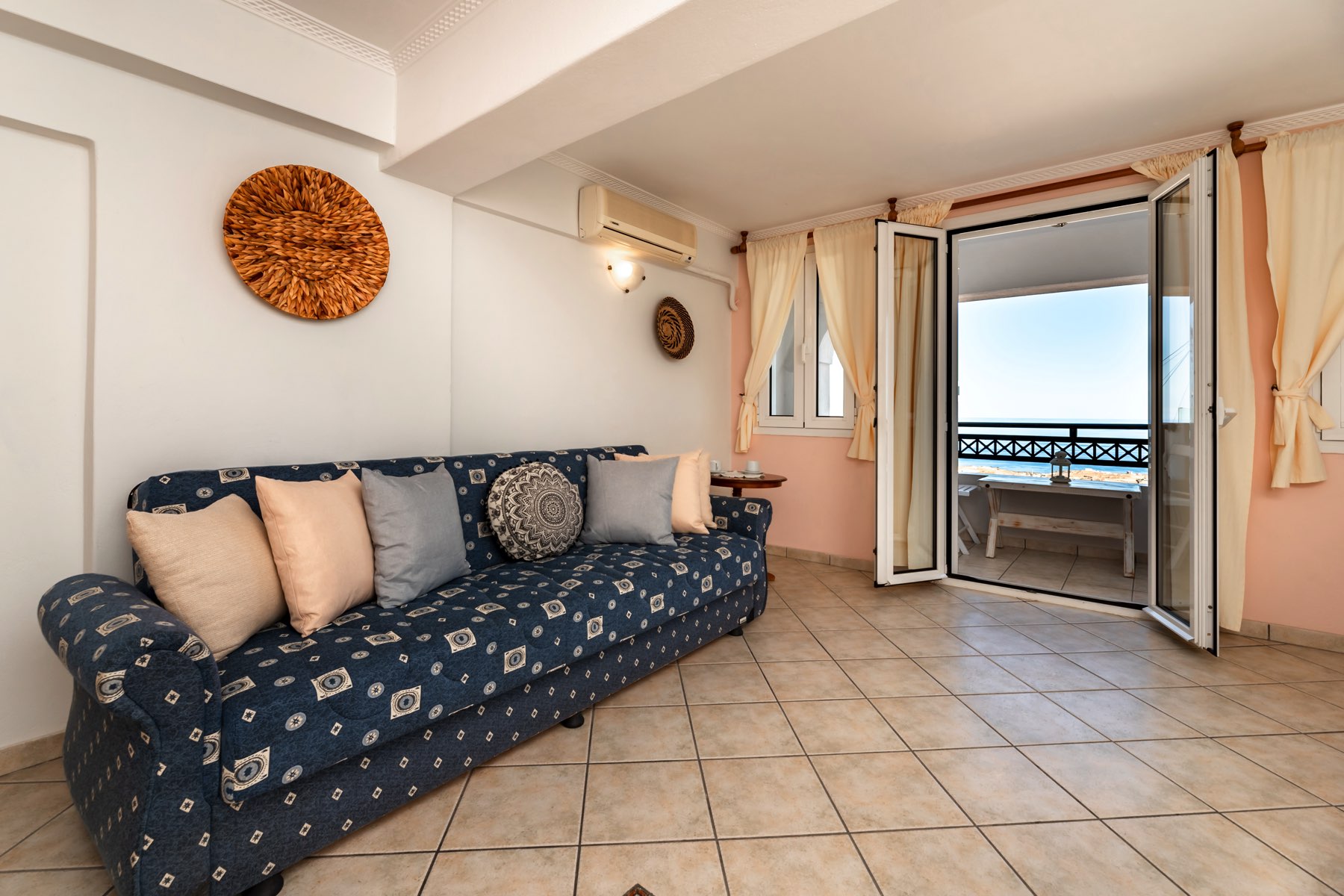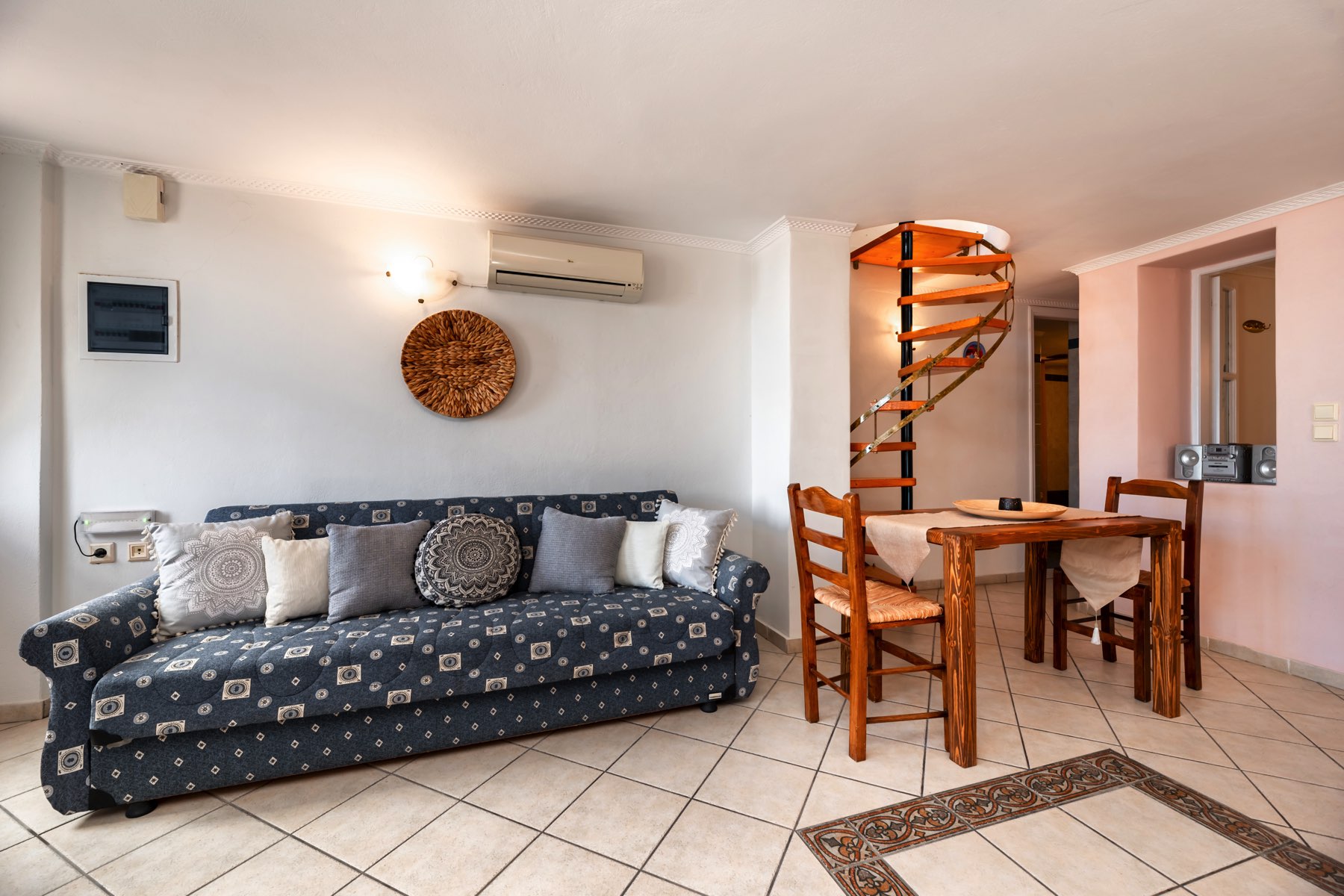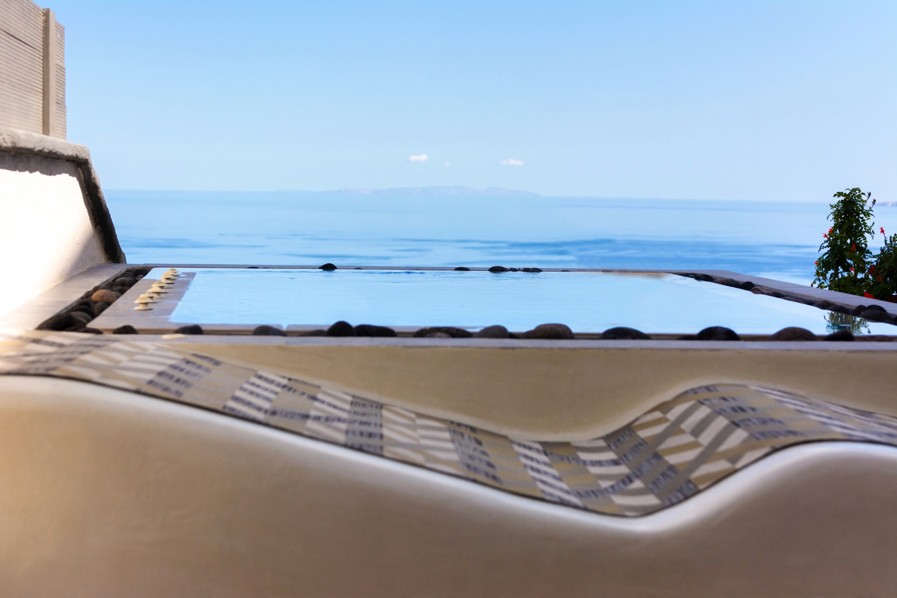 The Two Bedroom Apartment - Split Level with Sea View & Jetted Tub is a spacious accommodation for 6 guests that want to enjoy their stay and holidays in Santorini in privacy. At the upper floor of the Maisonette (45 m2) we find a separate private bedroom with a double bed, a living room with a sofa bed, a bathroom and a balcony with sea view. The ground floor of 55 sq. meters has a separate private bedroom with a double bed, a living-dining room with a single bed and a sofa bed, a fully equipped kitchenette, a bathroom and a big private yard with patio and sea view. The floors are connected with stairs. Do not miss staying in the Maisonette of Hotel Thira where you can enjoy tranquillity and comfort in a serene location with great sea views.